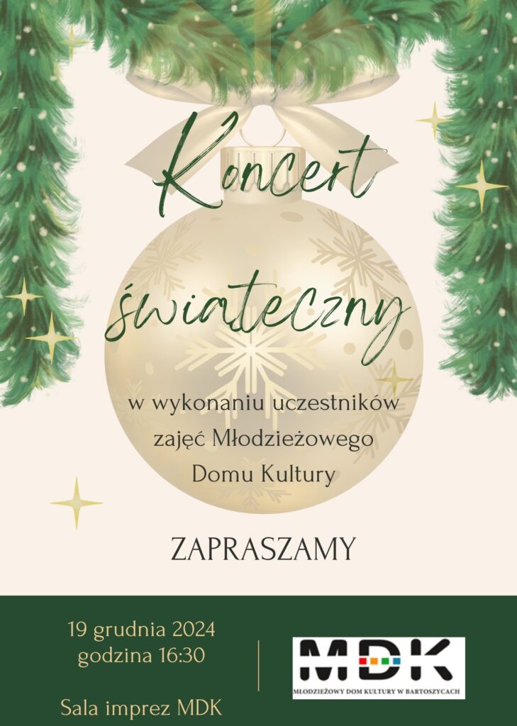 W dniu 19 grudnia 2024 o godzinie 16.30 zapraszamy wszystkich na Koncert Świąteczny w wykonaniu uczestników zajęć Młodzieżowego Domu Kultury w Bartoszycach.