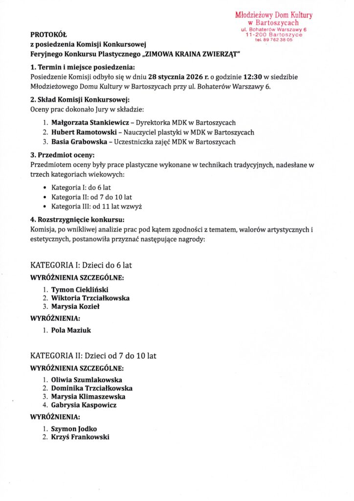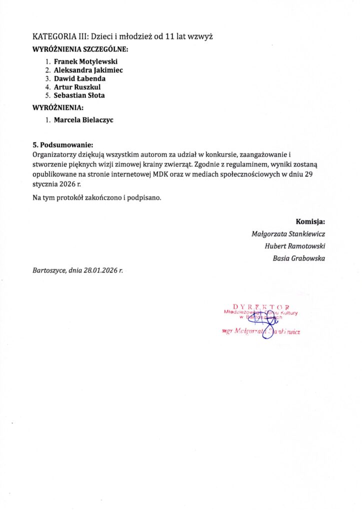 Posiedzenie Komisji odbyło się w dniu 28 stycznia 2026 r. o godzinie 12:30 w Młodzieżowym Domu Kultury w Bartoszycach. Prace oceniane były w trzech kategoriach wiekowych. Po wnikliwej analizie prac pod kątem zgodności z tematem, walorów artystycznych i estetycznych, Komisja przyznała nagrody i wyróżnienia. Dziękujemy wszystkim autorom za udział w konkursie, zaangażowanie i stworzenie pięknych wizji zimowej krainy zwierząt. Załączamy protokół Komisji Konkursowej.